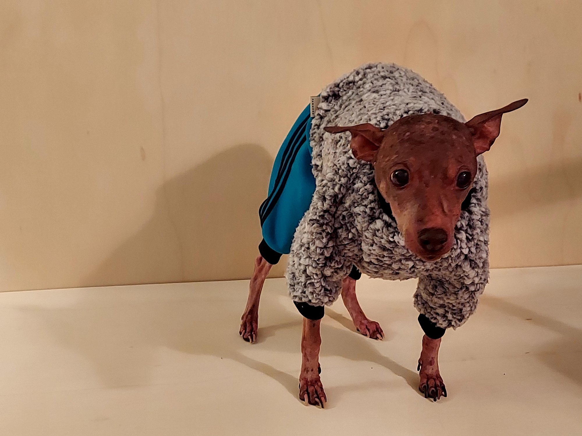 A plush one-piece lounge suit crafted with ultra-soft sherpa and relaxed sweat-pant styling, designed to keep your canine warm, stylish, and effortlessly comfortable on winter days.
